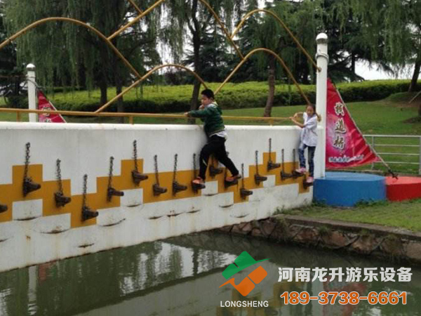 秋千橋就是一座橋上吊著高低不同的秋千,你必須從一個個晃動的秋千上踩著過橋。它的難點在于秋千本身在晃,你的手抓住秋千繩子吃了分量后,秋千晃得更沒有規(guī)律了,你的腳就不容易踩住秋千踏板,一失足,下面可是半人高的河水啊。
